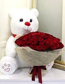 60-75 cm uzunluğundaki büyük boy oyuncak ayının kucagında 101 adet kırmızı gül ile hazırlanmış sevdiklerinize gönderebileceğiniz harika bir seçim