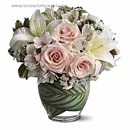 Cam vazo içerisinde güller kazablanka ve çeşitli bahar çiçekleriyle hazırlanmış sade butik bir tasarım.