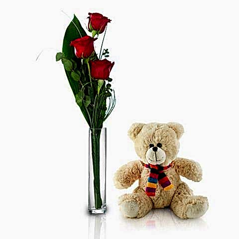 Cam vazoda 3 adet gülden hazırlanmış oyuncak ayılı sevimli bir aranjman