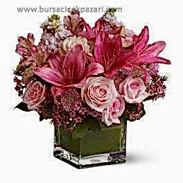Cam vazoda lilyum gül ve şebboy çiçekleriyle hazırlanmış pembe ağırlıklı masa üstü şık bir tasarım