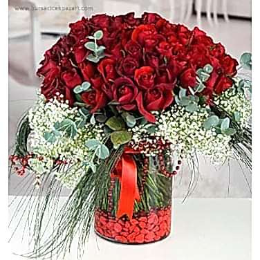 Cam vazoda 41 adet gül ile hazırlanmış dekor taşları ve çeşitli aksesuarlarla tamamlanmış sevdiklerinize gönderebileceğiniz harika bir seçim.