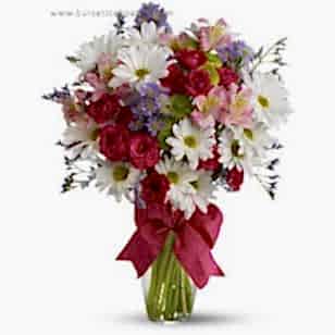 Cam vazo içerisinde krizantem gül ve bahar çiçekleriyle hazırlanmış mis kokulu bir aranjman.